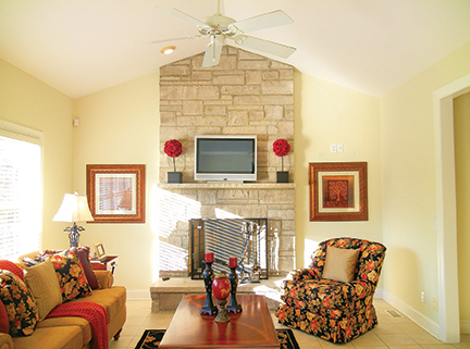 The gourmet kitchen with granite, custom cabinetry and upscale appliances is ideal for anyone who likes to cook—or to have someone do it for them! McNutt and his partner were very involved in the St. Louis community and entertained often for charity events and holiday parties. “We didn’t cook, but the caterers always loved all the appointments in the kitchen,” he laughs. The two-story main living area was perfect for holding large gatherings, and it’s where the couple spent most of their time. “We always had the fire going in the winter,” he recalls. “If it was snowing outside, we just wanted to stay in. The house is large, but it’s very cozy and comfortable.” He also loved the sunroom off the back.