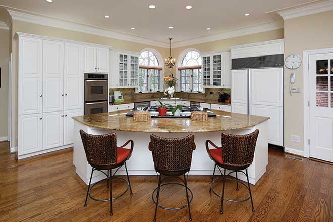 He says his mother had always designed the houses he lived in growing up, which influenced him to adopt that skill as a hobby. “I wanted a Georgian Colonial style and drew up basic ideas for the layout,” he explains. Several key things were incorporated into the floor plan: a large, open kitchen; breakfast room and family room area; an attractive office and library; and a dramatic two-story entryway. Architect Carl Day and builder Jerry Vouga brought the homeowner’s visions to life with a cherry wood-paneled office, great room with cathedral vault ceiling and gourmet kitchen. “Our favorite area is the kitchen and adjoining family room” he says. “It’s all so open with great views from the large windows overlooking the pool.” He says when they hosted parties, most often around the holidays, they could comfortably fit 100 guests.