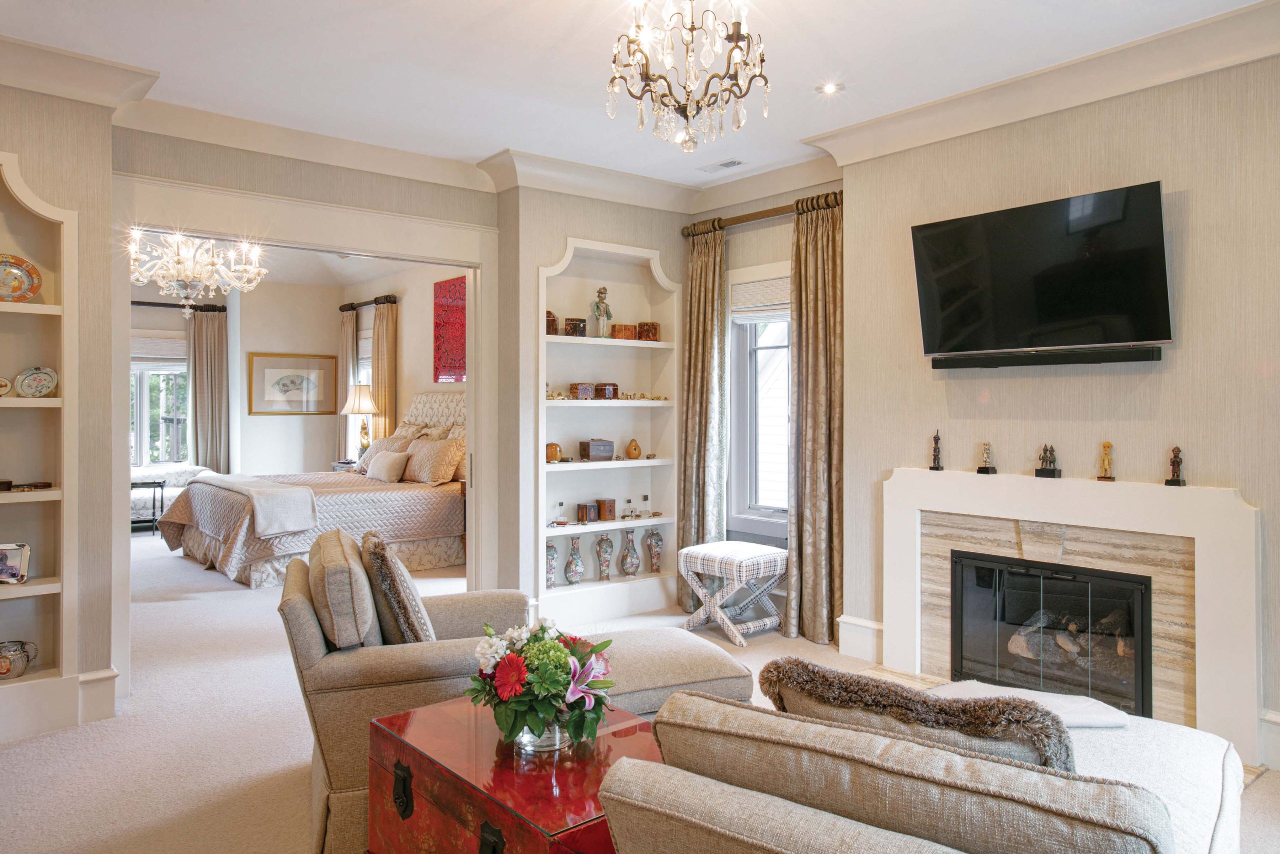 The house has great flow, so we get to enjoy all of the rooms. We just love everything, so it’s difficult to pick just one spot. We do enjoy our upstairs primary suite. We each have our own bathroom and closet, and adjacent to the bedroom, there is a setting room with a fireplace. It’s a wonderful space to retreat to in the evening, especially in winter with a fire going. You can read or watch some TV and just let the world go by. It’s a very comfortable and inviting place for two people—and our dogs, of course.