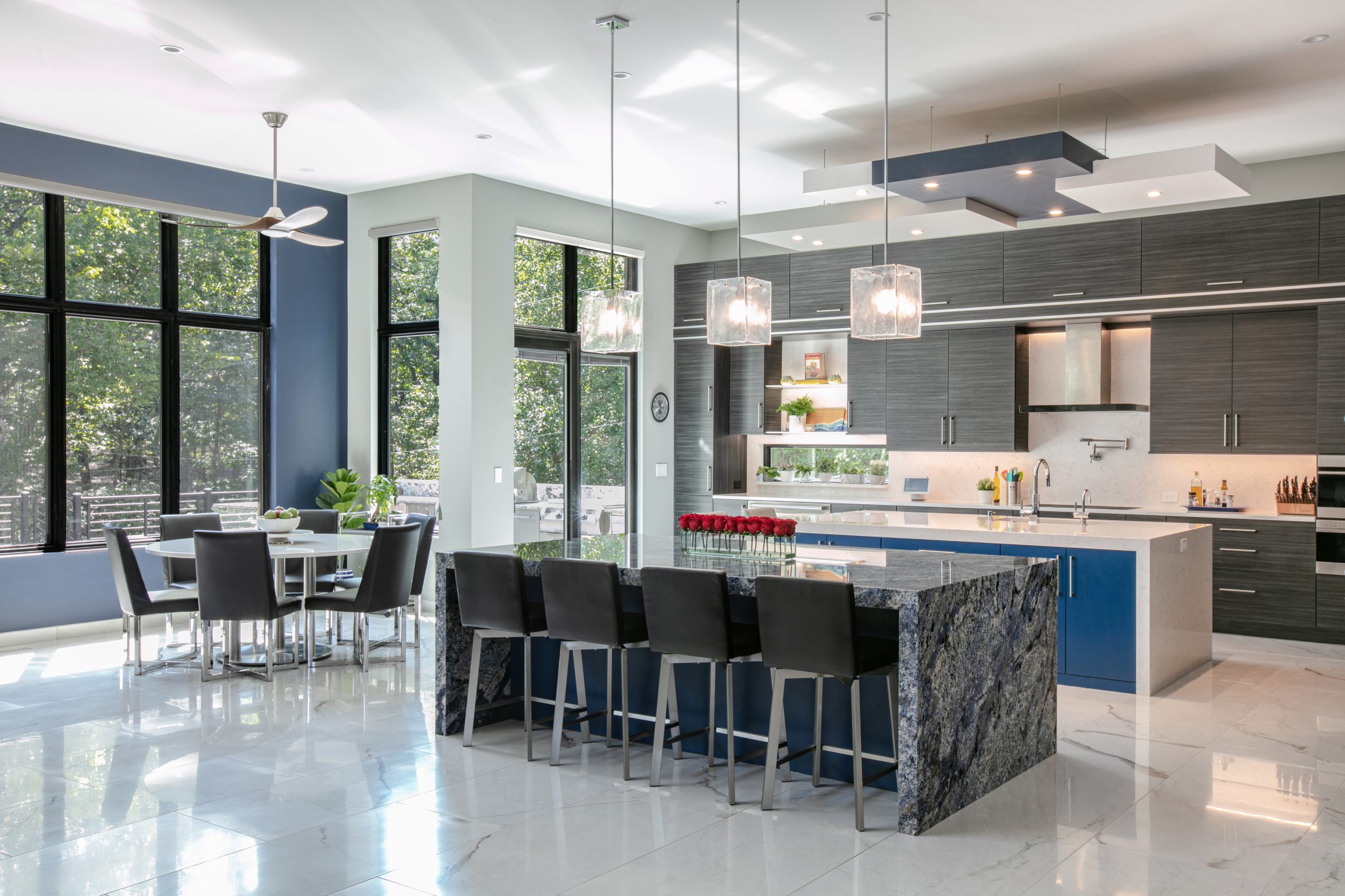 We can entertain easily upstairs or downstairs. There is plenty of room. The lower level has a full kitchen, so we have everything we need to host down there. Upstairs, we have two islands. One is a prepping area, and the second has eight chairs around it. That’s where we usually have dinner. We haven’t used the dining room yet because we haven’t needed to go in there.