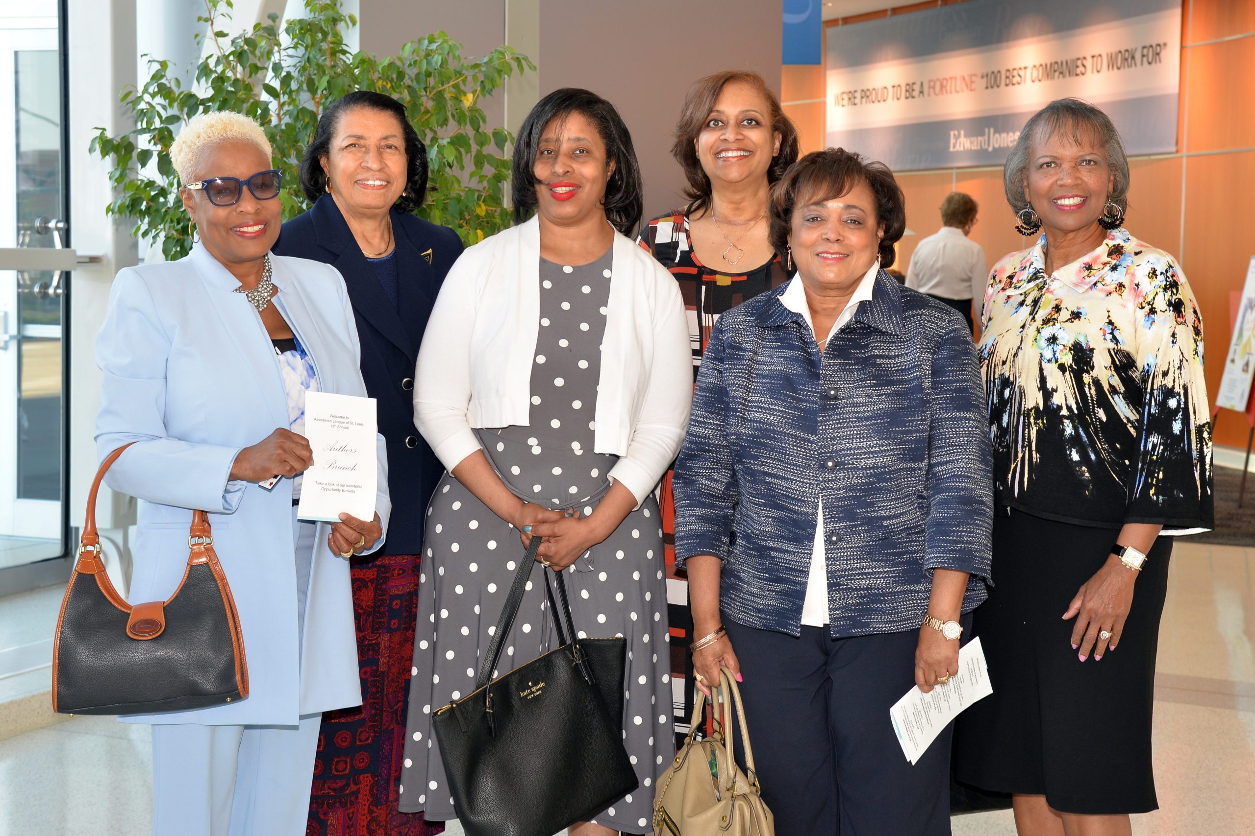 [What] 13th annual Authors Brunch [Where] Edward Jones Atrium [Why] The all-volunteer service organization’s members identify, develop, implement and fund ongoing philanthropic programs to serve the specific needs of children and adults in the St. Louis community. [Who] President Suzanne Pratl, president-elect Roxie Randolph, chairman Cathy Inkley, authors Amy Dickinson and Kevin Killeen [Highlights] Brunch, introduction of authors, book signing.