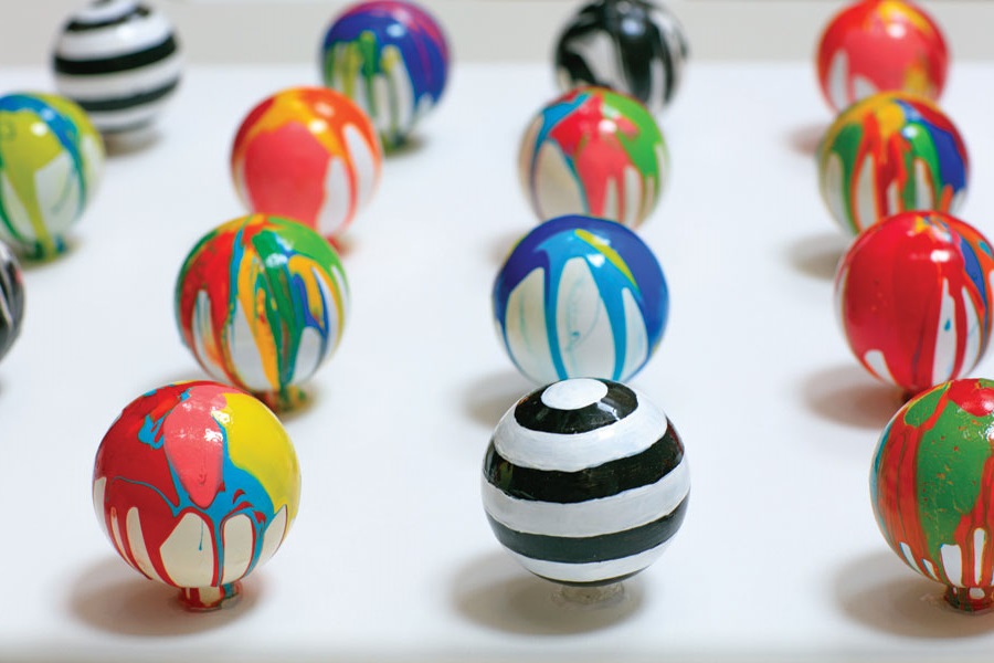 SZ | There are two really large paintings with poured stripes of color. I’ve had a lot of interest in those, but I’ll probably never sell them. I painted them when my girls were little. They’re triplets, so I didn’t get to go out much. I’d gone to an art fair and had dinner plans, but suddenly, I was crazy inspired and couldn’t wait. I went home and didn’t have any blank canvases, so I just started painting over some that I never really loved. I spent all night pouring paint over and over. It was like waking up from a dream and trying to remember the details; I had to finish them. I just love them. That’s the height of inspiration, when I just have this idea and have to get it done. I’m doing a series of painted spheres that I call marbles. I had an art opening in November, and even though everything was done, I had this crazy idea and had to stop everything to make sure they got into the show. For the Fashion Fund collaboration, I made a series to match the spring collection of Ruben Reuel’s Demestik clothing line.