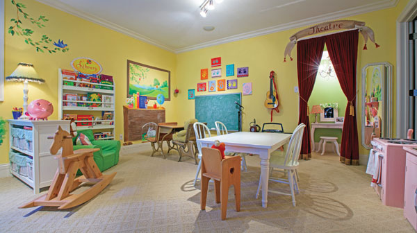A | When we moved in, it was just my husband and I; our youngest daughter got married about six months later. We had one grandchild while building the house, but we’ve got six now. They’ve all enjoyed the playroom. I was inspired by a friend who has a fun playroom for her grandsons, and I wanted to do something similar. I came up with the design to have different locations for different activities. It’s divided into a school room, music area, theater with chandelier and play clothes, kitchen, and art museum where the kids can display their artwork. The little desks in the school room actually came from my dad. He bought them from an old school that was being torn down and refinished them for my girls when they were little.