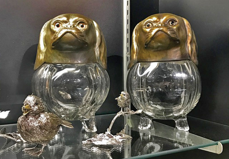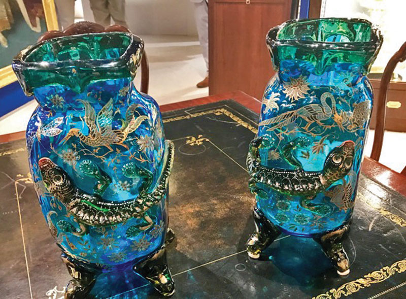 Other items of interest were a unique pair of biscuit jars dating from around 1880-1890 made of crystal with copper puppy heads. They were somewhat affordable at $4,400. M.S. Rau offered a pair of French hand-painted, blue glass vases by Auguste Jean from 1900 that had several zeros attached to the price.