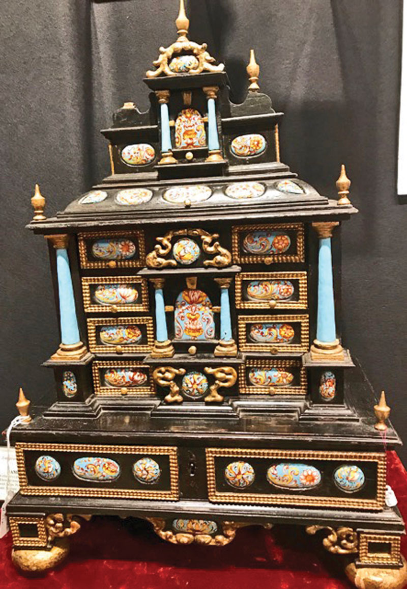 Among many other unique and rare finds, the European Decorative Arts Company showcased a 17th-century collector’s cabinet from Hamilton Palace that once stood in Scotland. Consisting of ebonized and gilded wood with 35 decorative enamel on copper plaques and blue enamel pilasters, it is a whimsical cabinet for the collector who has everything. The plaques are all decorated with Holland’s flower, the tulip.