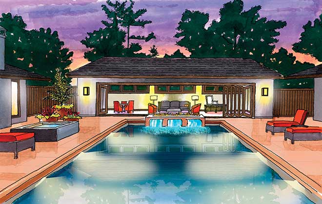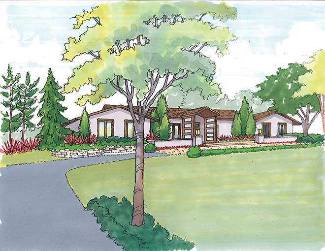 I have recently moved into a very interesting U-shaped ranch in West County. I have transformed the dated interior and now need to move to the exterior. I have two questions: the first is how to transform the front façade’s look from dull to dramatic with minimal expense. Next, I would like to add a pool house structure to the home’s standout feature—a courtyard with swimming pool. I would love to have a simple, elegant structure that would have sliding/stacking doors and a simple multiuse space. Could this look good? I’m also considering rebuilding the pool.