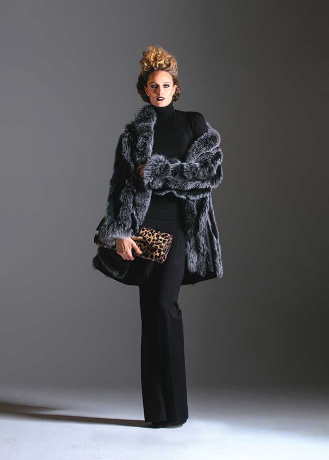 Linda Richards silk and fox fur reversible coat, $1,540, Yoana Baraschi knit flare pants, $218; both from Mister Guy Women’s. Majestic Paris turtleneck, $130 from Neiman Marcus; Liza B leopard print patent leather clutch with crocodile closure and red interior, price upon request, ej4lizab.com