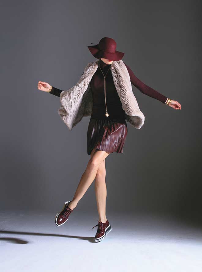 Linda Richards rex rabbit vest, $568 from Mister Guy Women’s; J Crew Factory pleated mini skirt, $85, and H&M wool hat, $19.99, both from Taubman Prestige Outlets. Majestic Filatures turtleneck, $135, and Prada patent leather lace-up shoes, $975; both from Nordstrom. Jewelry, model’s own.