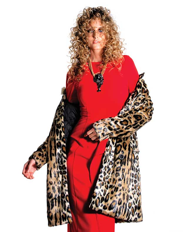 Alice and Olivia ‘Montana’ double-breasted leopard peacoat, $595 from Nordstrom; H&M knee-length dress, $49.99 from Taubman Prestige Outlets; Kate Pollmann custom vintage necklace, price upon request, katepollmann.com