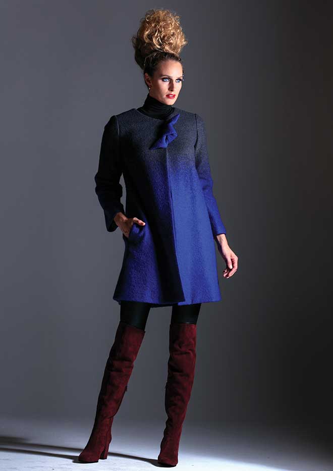 An Armani topper radiates hues of cool blues. The perfect length for leggings and boots, the boiled wool coat fills the bill for warmth, too.