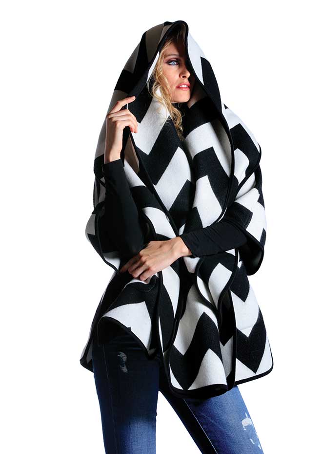 Akris Punto zigzag cape with scarf, $1,590, Majestic Paris turtleneck, $130; both from Neiman Marcus. Frame Denim jean, $239 from Nordstrom.