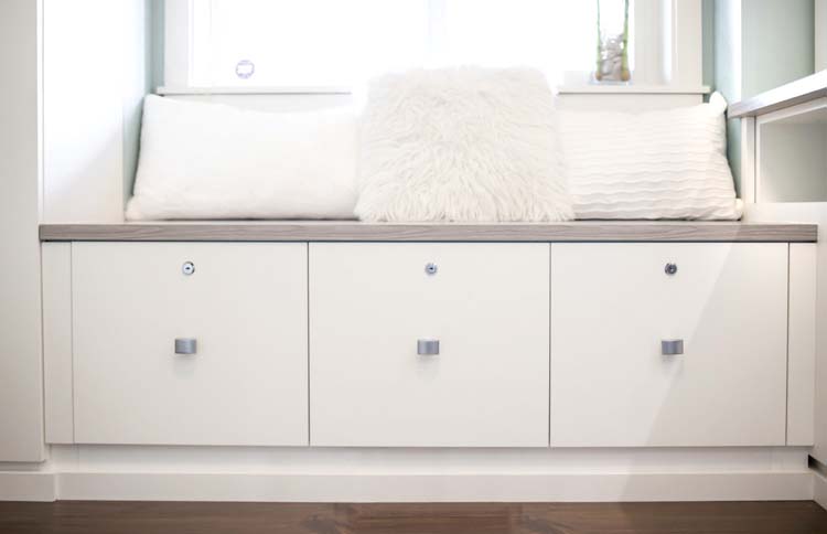 Locked drawers and cabinets are great for items you want to keep hidden. Designs with a continuous top shelf offer out of reach storage, which is perfect for gifts. In our designs, we also have decorative boxes that coordinate with our material and fit perfectly on our top shelves. The boxes are great for gifts or out of season or sentimental items our clients want to store out of the way.