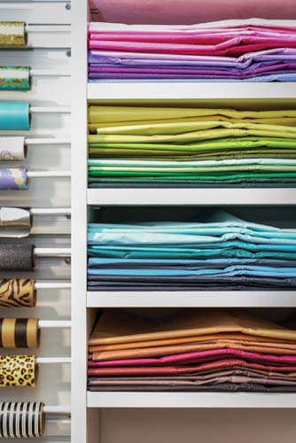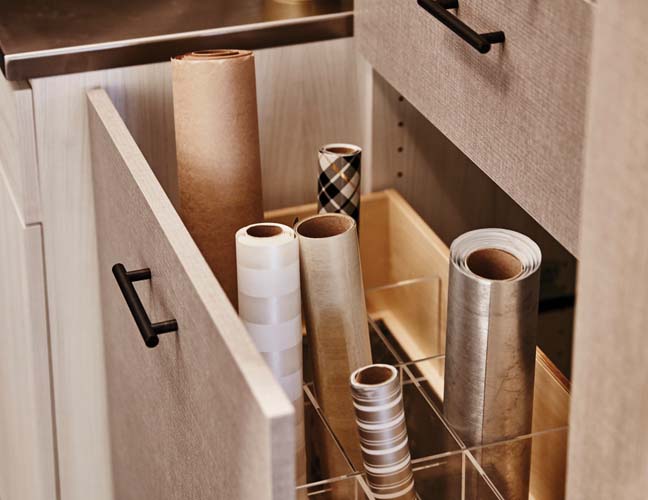 Wrapping stations are a must. There are several options, including wall mounted solutions for wrapping paper, vertical and horizontal wrapping paper storage within drawers, wall mounted solutions for ribbon, and drawer and shelf dividers to keep tissue paper, ribbon and cards perfectly organized.