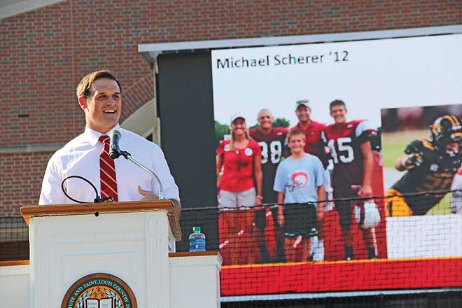 Alum Michael Scherer, now a linebacker at Mizzou, was the keynote speaker during a groundbreaking ceremony for MICDS’ new athletic facilities. The new area will include the Steward Family Aquatic Center and William R. Orthwein Pool, as well as a multi-sport stadium area that houses the O’Hara Family Field and the Holekamp Track and Field Stadium. Starting next summer, MICDS sports programs will benefit from the new facilities.