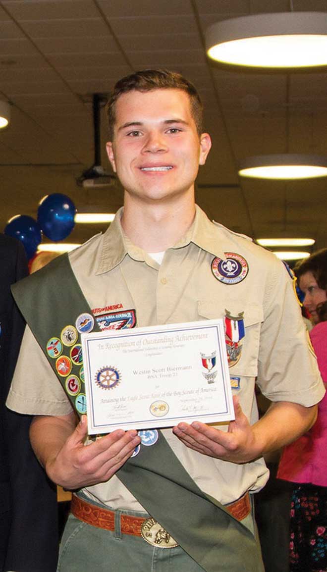 Three area students recently became Eagle Scouts, completing community service projects. SLUH junior Westin Biermann of Troop 21 in Clayton created a garden for the Brentwood Early Childhood Center to help students grow healthy food and learn about healthy eating. SLUH sophomore Nick Prainito of Troop 918 in Cottleville oversaw the building of three benches for the City of Cottleville Dog Park. And Clayton senior Matthew Straetker of Troop 21 in Clayton designed, planned and led 20 volunteers in the building and planting of two garden beds for the Healthworks! Kids’ Museum St. Louis. Since 1912, only 2 percent of eligible Scouts have earned the organization’s highest honor!
