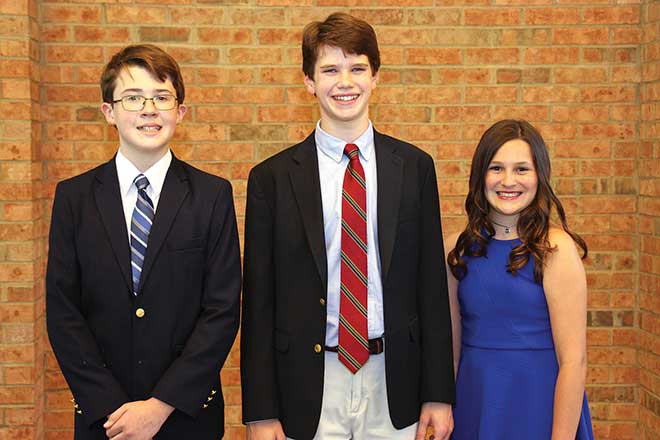 Three graduating sixth-graders recently earned awards for their academic achievements. Ryan Hardwick received the school’s Pauline Marshall Award for Scholarship for his high grade-point average. Anna Padousis received the Mary B. Rossman Award for Citizenship, and Logan Donnelly received the Alumni Award for Outstanding Achievement in a Specialty Subject for his accomplishments in social studies.