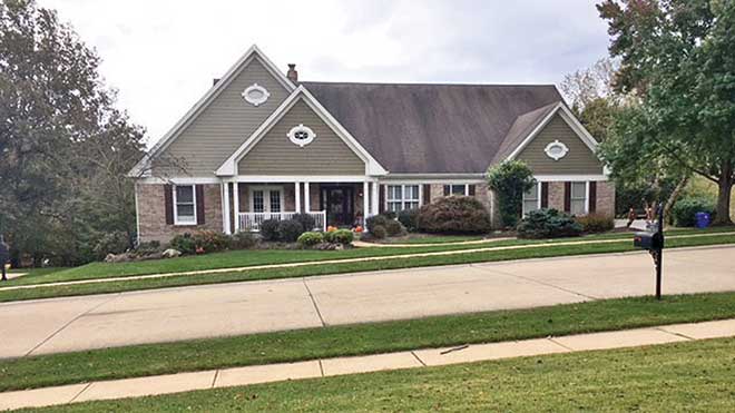I’m glad you asked for some ideas before you started with any work, because I think we can improve things here quite a bit. First, I think the current color scheme of khaki green and white with Oxblood shutters works well with your brick color. I think the asphalt shingle color called Weathered Wood (a mixture of greens and browns) would be a good looking choice.