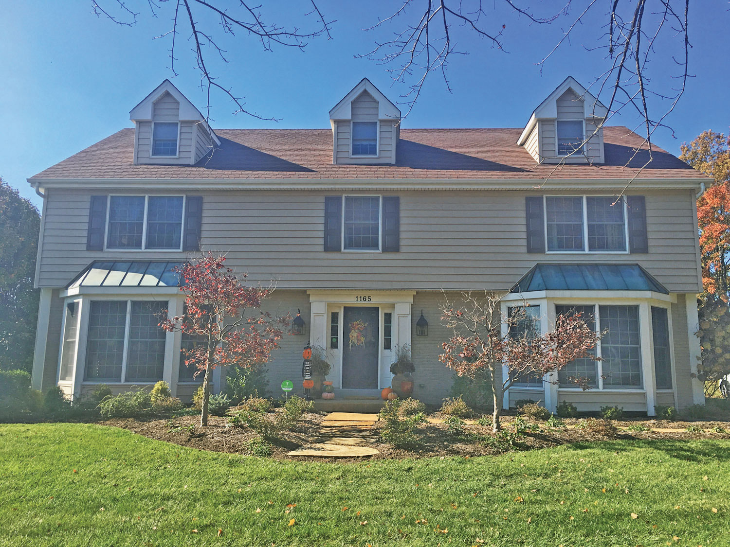 From the clumsily detailed roof dormers and undersized, inoperative shutters to the unfortunate vinyl siding and ungraceful copper-roofed bay windows, all of the components of this façade work against it, making it feel drab and average.