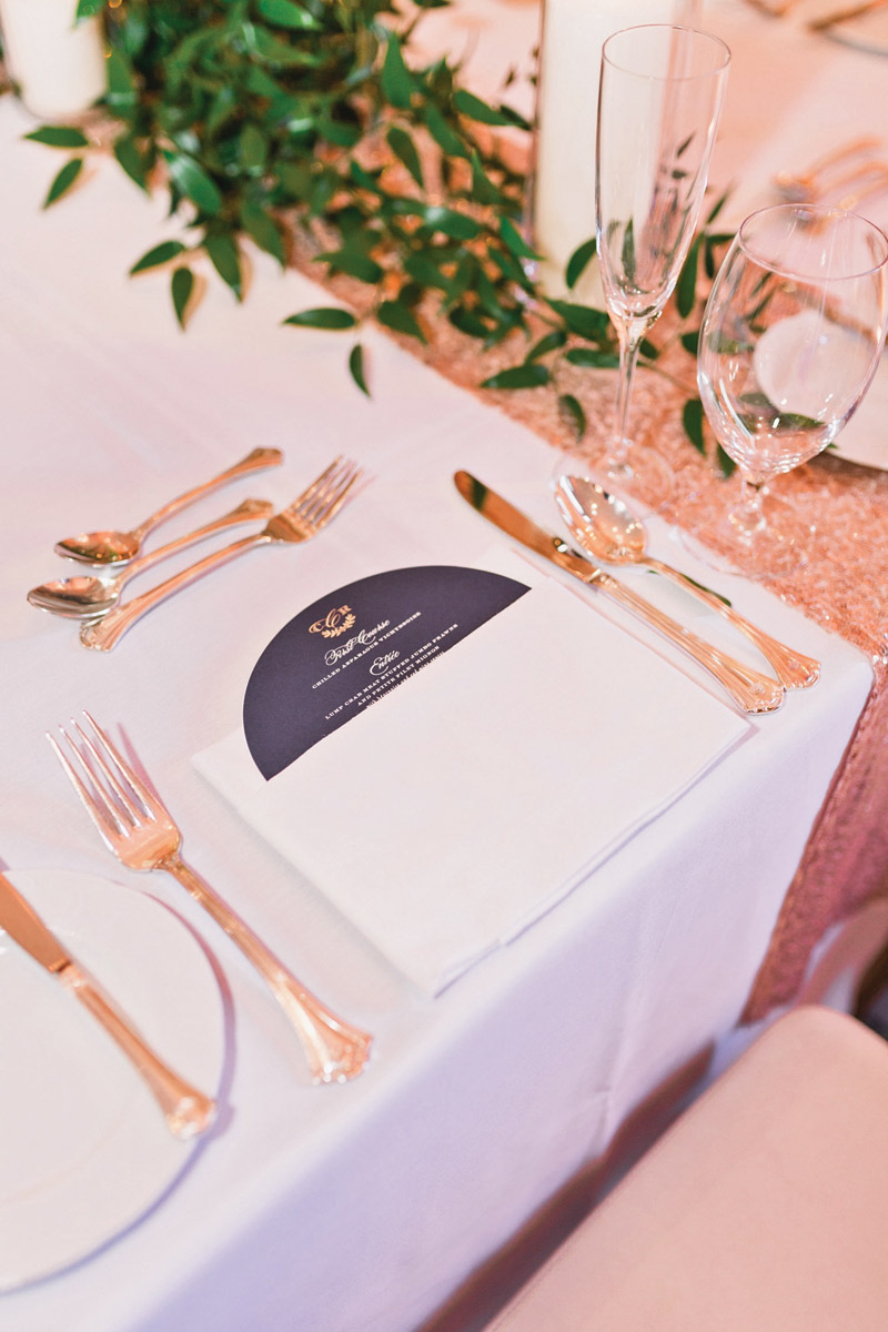 The reception featured a bold color scheme of navy blue and orange, and bartenders poured citrus cocktails. The two took lessons at Majestic Dance Studio to entertain guests with a foxtrot number. Macarons, a custom-designed fleur-de-lis monogram and other elegant touches served as a nod to Richard’s French heritage.