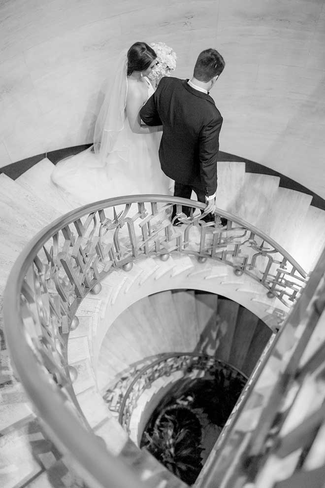She says the Friday night ceremony was very traditional, and the neutral color scheme perfectly accented the beauty of the Starlight Room at The Chase. “My grandma and grandpa, who have been married 65 years, had their first date at The Chase and have been going there forever,” Elizabeth says. “We celebrated their 60th wedding anniversary there, and I loved having our reception at the same place.” The couple’s first look in the stairwell of The Residences at Chase Park Plaza is her favorite memory.
