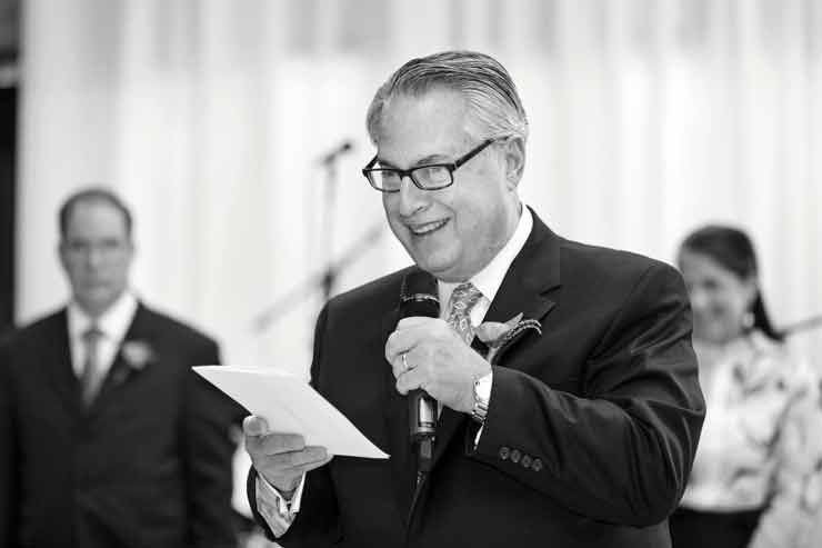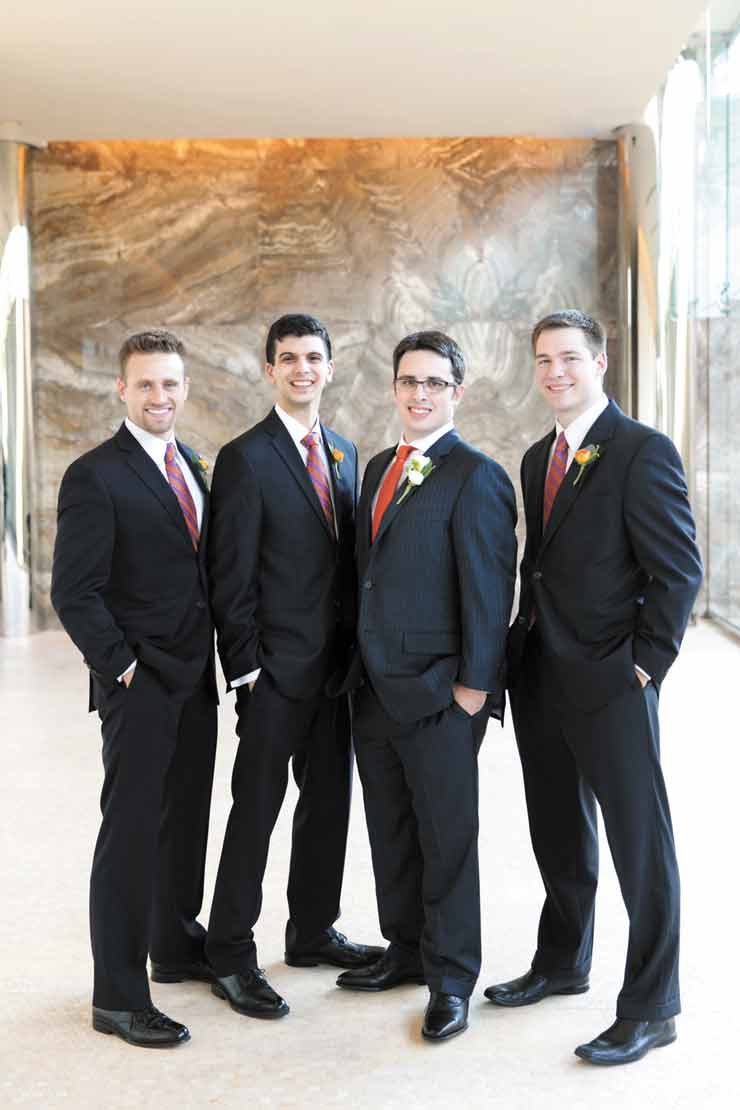 Julianne walked down a candlelit aisle toward her husband-to-be. They stood together under a chuppah, draped with the Jewish tallit used by Peter and his grandfather. Two rabbis from Temple Israel, husband and wife Amy Feder and Michael Alper, performed the ceremony together. “We met them going to a destination wedding early in our relationship,” Peter says. “It was an intimate, beautiful ceremony. Our parents stood up there with our bridal party, and everything Amy said was personal because we have a history with the rabbis.”