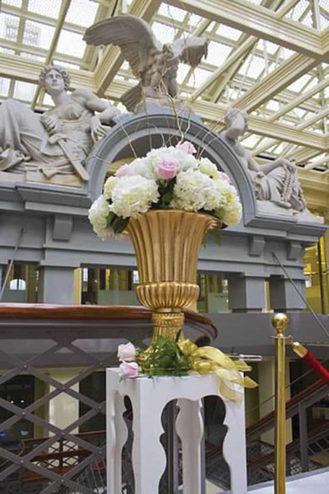 They wanted an elegant, romantic feel for the day, achieved through soft colors and beautiful venues. “My dress looked gray or lavender depending on the light, so since I had the pop of color, I wanted my bridesmaids in white,” Liz explains. An online search made them consider the Old Post Office for the ceremony. “We had never heard of a wedding there before and just loved it the second we walked in,” she says. The Chase, where the reception was held, holds many fond memories for Liz; her sister got married in the Khorassan Ballroom, and she often went there with her family while growing up. “There was no other venue that gave me the same feeling.” The couple chose the Starlight Room for its windows and terrace, where she and Brad had their first dance. “It was just us out there, and the weather was beautiful,” Liz recalls. “It was my favorite moment of the day.”