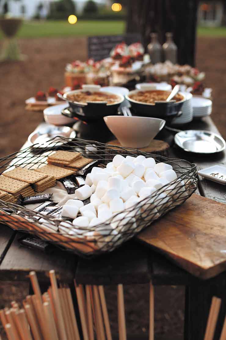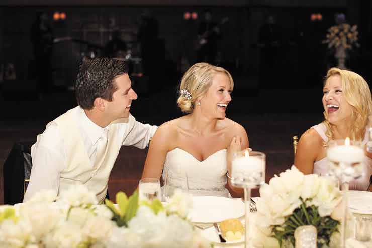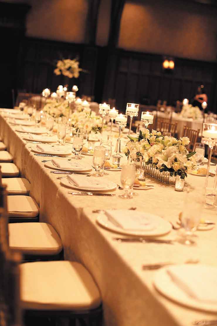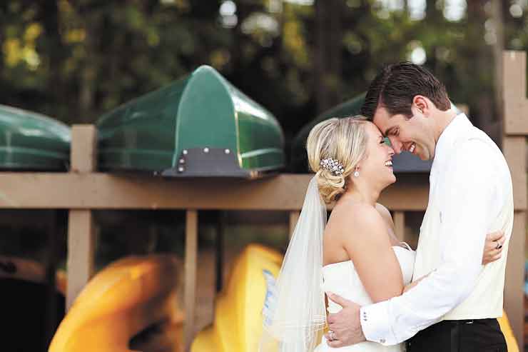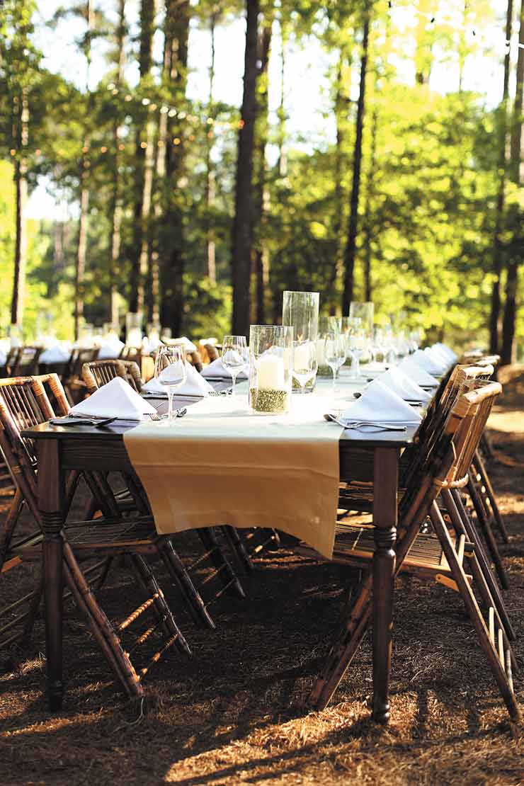 The couple was married at a June destination wedding at The Ritz-Carlton Lodge at the Reynolds Plantation in Greensboro, Ga. Guests arrived Friday for an outdoor rehearsal dinner served on long, candlelit tables nestled in a grove of trees. They took advantage of the lodge’s activities, which included swimming, golfing, water sports and a spa. “We had a big lunch out at the pool for guests, and everybody got to hang out before the wedding,” she says. “We kind of took over the resort.”
