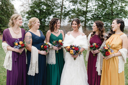 “We wanted a small, close-knit wedding with a bit of an Art Deco theme,” Katie says. “I’m an interior designer and am earning a master’s degree in architecture, so I love working with color and form.” Her bridesmaids chose their own dress styles in different jewel tones with flowers to match, and the groomsmen sported coordinating bowties.