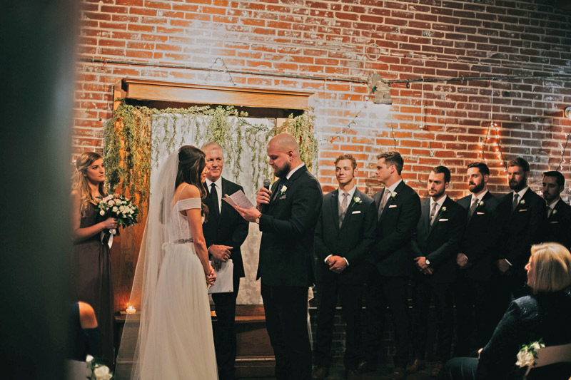 The bride is an interior designer and says she happily took the event’s creative decisions into her own hands. “My mom and I enjoy working on projects together, so we did as much of it as we could and included a lot of greenery and natural elements,” Leisha says. “There were many trips to Hobby Lobby and thrift stores. We spent so much time shopping that I still find myself looking for those things when I walk into a store!” They put together a collection of mismatched brass candlesticks and other eclectic touches for the reception tables, which worked well with the venue’s exposed brick and wood decor, Leisha says. “We displayed photos of the different phases of our relationship throughout the space,” she adds. “Our guests really enjoyed looking at them.” Friends and relatives made cookies and cake pops for the reception, and the bride chose white flowers with leafy green accents to complement her attendants’ dusty maroon gowns.