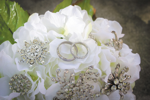 Inspired by a family love story, Krista and John chose a vintage theme for their wedding day. “My great-grandparents were madly in love with each other,” Krista says. “They met when they were young and their devotion was endless. My great-grandmother embroidered handkerchiefs for my great-grandfather’s suits, so John took one down the aisle, and I carried one she embroidered for herself.” Additionally, Krista’s bouquet was made of vintage brooches from her great-grandmother and other beloved relatives.