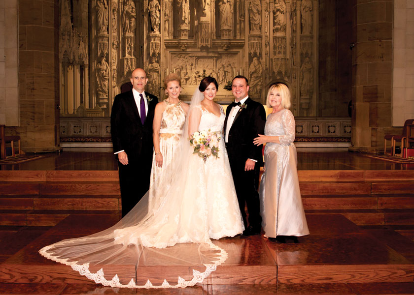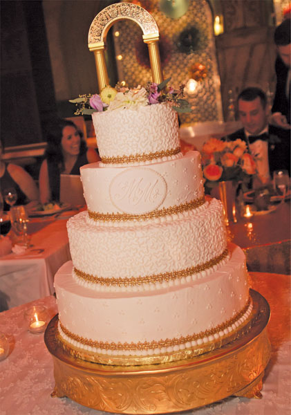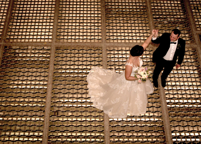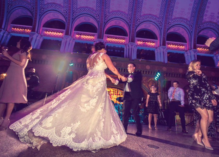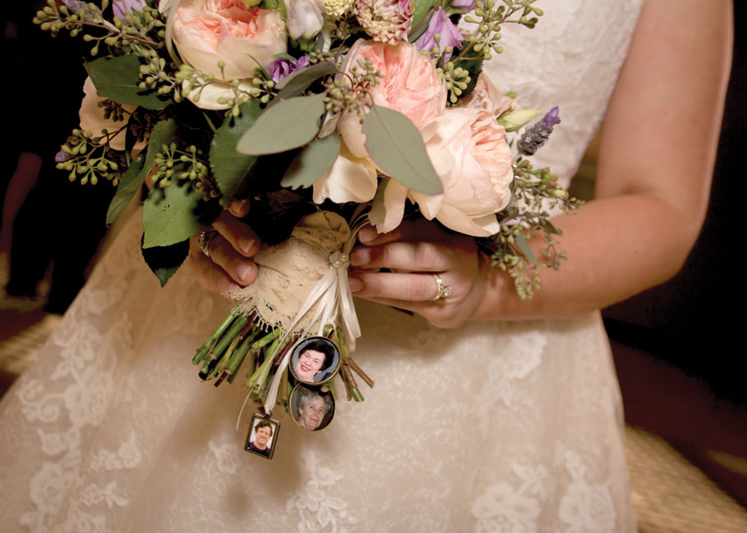 The couple incorporated the historic landmark in other ways as well. “We had an illuminated cake topper in the shape of a Grand Hall arch, and we used the theme on our invitations and cocktail napkins,” Meredith says. An artist even painted the reception as it was happening. Other special touches included miniature photos of Mike’s late father and Meredith’s grandmothers on her wedding bouquet.