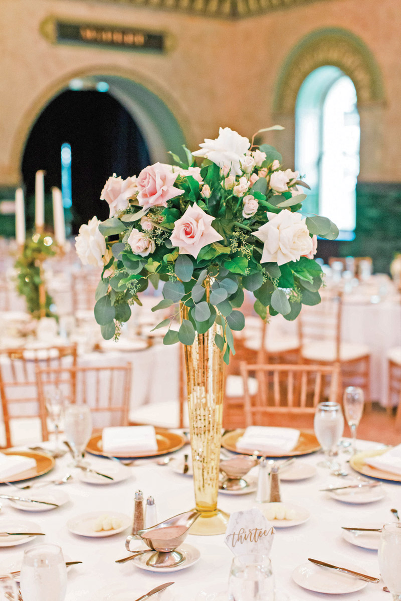 The couple said their vows at the Shrine of St. Joseph and adjourned to nearby Union Station for a Grand Hall reception. “The hall is so beautiful on its own, it really didn’t need much decoration,” Stephanie says. “We did bring in special candelabra and eucalyptus accents for the tables and chairs, and used some of the bridesmaids’ bouquets as centerpieces.”