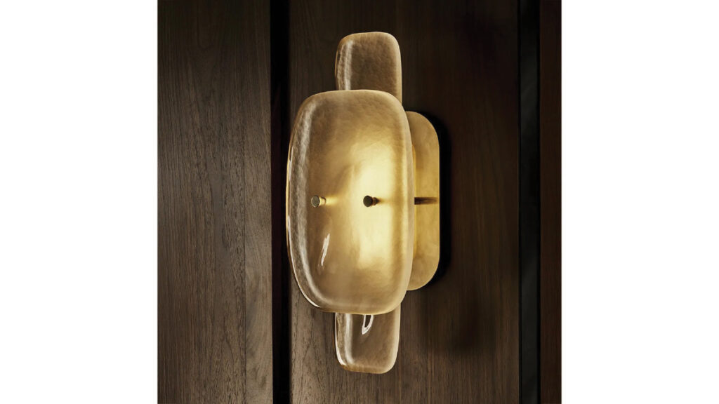 The Simona collection of sconces by Waterworks are handmade in Italy from thick slabs of Murano glass. Available with dimmable LED lighting and brass and nickel finishes at Immerse.