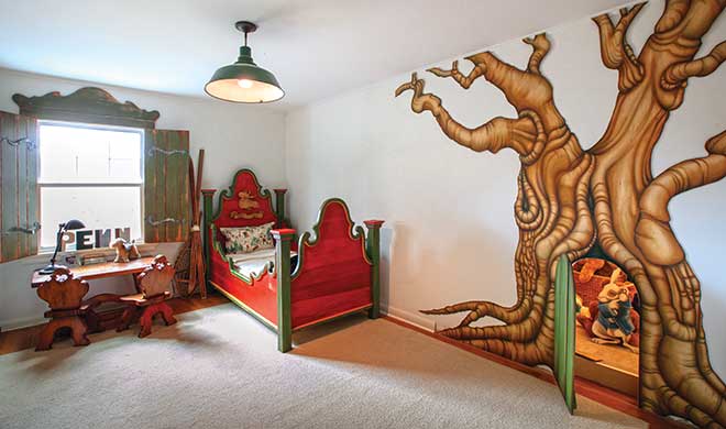 That was all my mom. There was a closet adjacent to the room, so she suggested cutting a mouse hole and using it as a secret play area. It was the room of my youngest son, who is 5; I have four boys up to the age of 19. He always had a ton of toys in there. My dad does woodworking as well, so he built and painted the tree, the little door, the shutters and the bed! The little guy loved it.