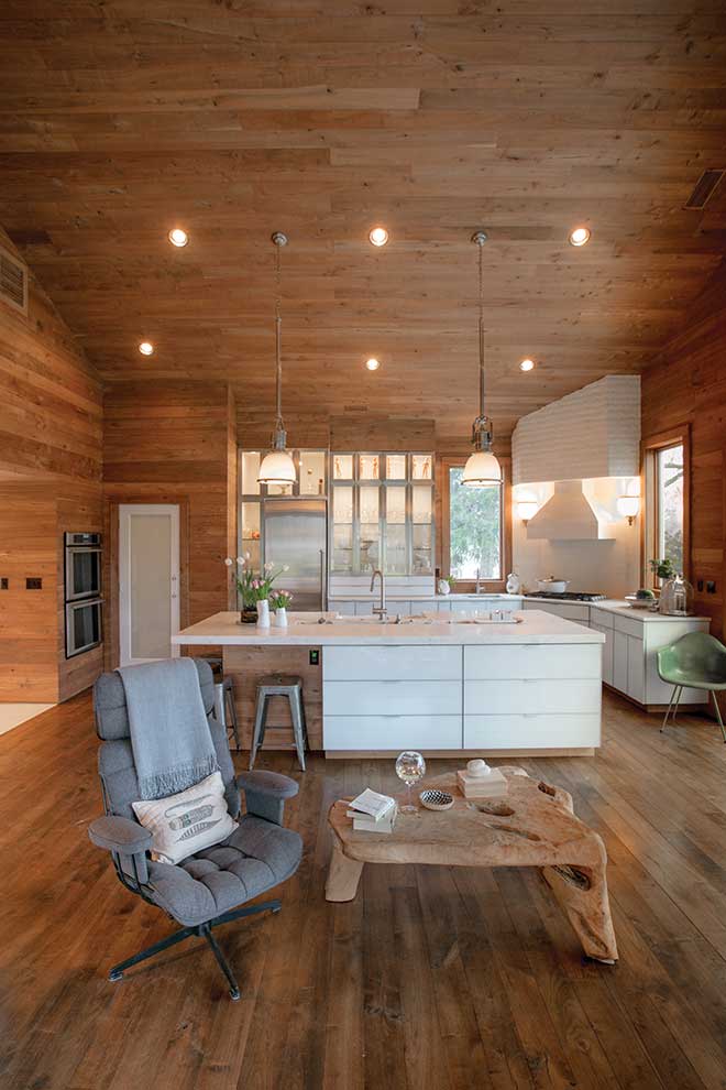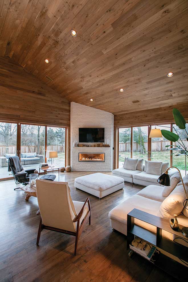 It’s walnut. I wanted that room to be open and big, but if your ceiling is too high or it’s too vast a space, it can become cavernous. I wanted it to stay cozy, so I started with the wood on two walls to help with that. Then I just kept going on the ceiling and another wall; my contractor was afraid it would be dark, but I still went for it and am glad I did!