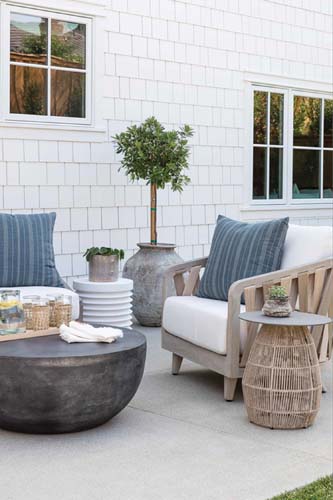 - Mix and Match: “We like to mix and match to bring warmth, texture and personal style to an outdoor furniture set,” note Jenny and Kate. The mix-and-match method is a wonderful way to add layered interest and personality to your outdoor area. This approach invites the eye to explore your outdoor design and take note of each unique texture it has to offer.