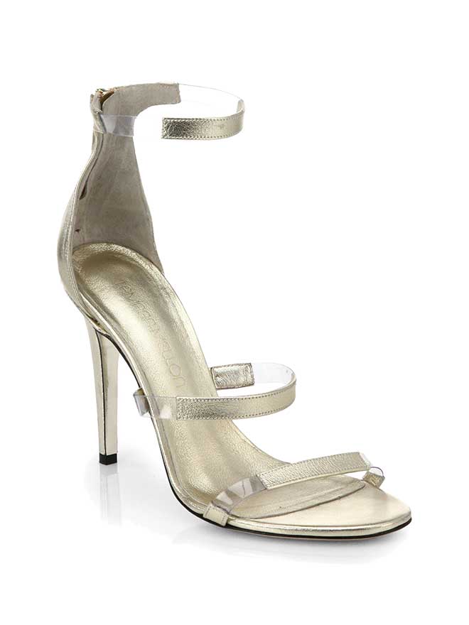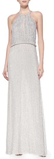 Parker Black Lita Sequined Halter Blouson Gown ($595, Neiman Marcus); Tamara Mellon Frontline Metallic Leather & Translucent Sandals ($595, Saks Fifth Avenue); Gucci Broadway Leather Evening Clutch ($990, Saks Fifth Avenue)