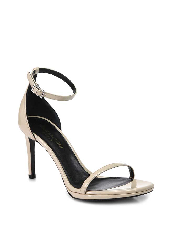 The Kooples Lace & Crepe Strapless Dress ($355, Saks Fifth Avenue); Saint Laurent Jane Patent Leather Ankle-Strap Sandals ($795, Saks Fifth Avenue); Melinda Maria ‘Laura’ Station Bangle ($68, Nordstrom)