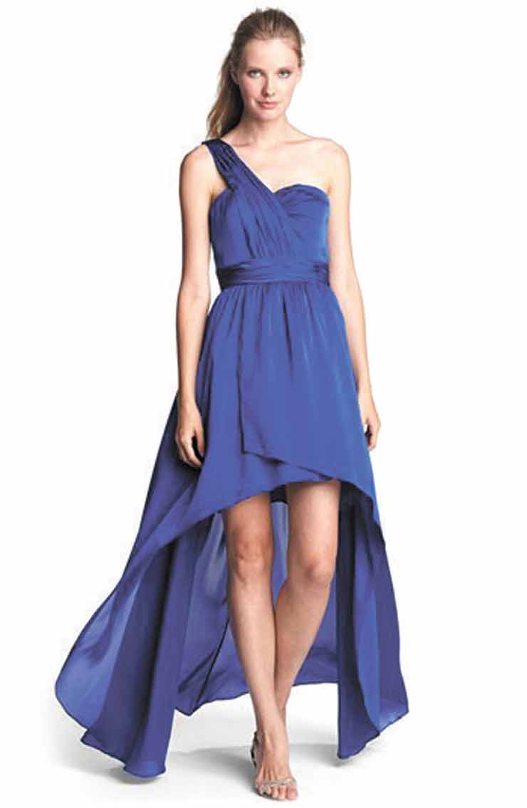 Be fashion-forward with a one-shoulder gown with a high-low hemline. Glittery drop earrings and heels complete this elegant look.