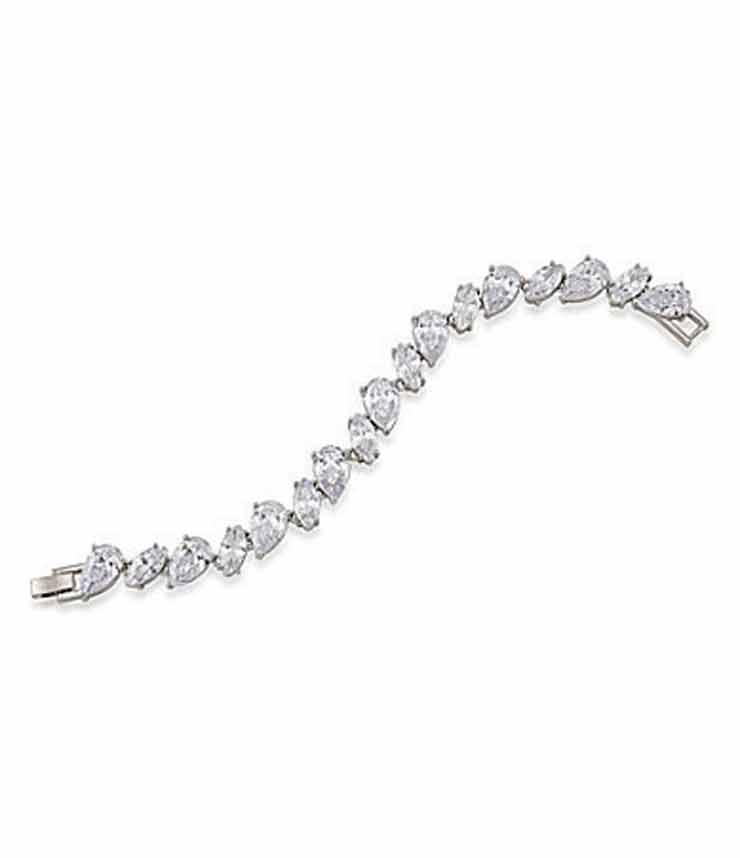 Mesh trim provides a fresh update on the classic floor-length column dress. The long skirt allows you to add height with a heel, while a linked-crystal bracelet adds bling.