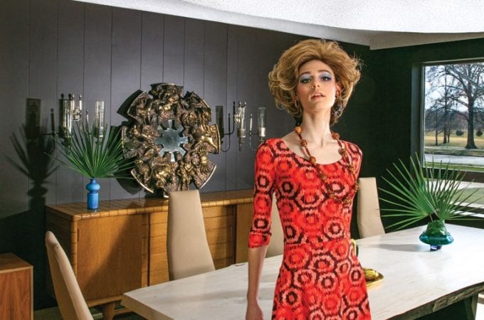 - Adam Lippes burnout velvet top, $1,590, Alice + Olivia ‘Dylan’ pant, $295; both from Neiman Marcus | Gold belt, $34.99 from H&M at West County Center | Bracelet, model’s own | Kelly Wearstler marble vase from Viceroy Miami, Vintage lounge chairs attributed to Fritz Hansen with Lee Jofa velvet, pair of midcentury Italian lounge chairs, vintage barware; all available from Interior Motives LLC and @1stdibs; Adrian Pearsall coffee table courtesy of Matthew Reed