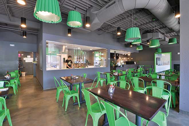 The interior has kelly green light fixtures and metal chairs—not particularly conducive for date night—but the food is enticing, especially the hand-pulled noodles. There’s a glassed-in kitchen area where diners can watch the dough being worked and stretched into the longest noodles you’ll ever find—at least they’ll feel like it when you try eating them with chopsticks!