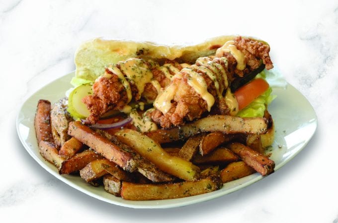Pictured at top: Lobster Tail High Class Man | Hand-breaded 5 oz. lobster tail, lettuce, tomato, onion, pickle and Bang Bang aioli on grilled garlic bread