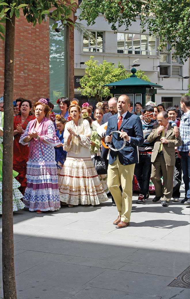 Historically, since the time of the Visigoths, the area was known for salt mining; in fact, the word ‘salary’ originates from the custom of paying workers with salt (or sal). Seville also is known for vino de Jerez, which the British anglicized into the word ‘sherry.’ The capital of the Moorish empire, Seville also is renowned as the center of Flamenco dance, so you may be treated to an impromptu performance in the streets, like we were, if you happen to visit on a festival day. Processions of men with guitars and ruffle-clad women sang and danced their way through the scenic squares of the old city.