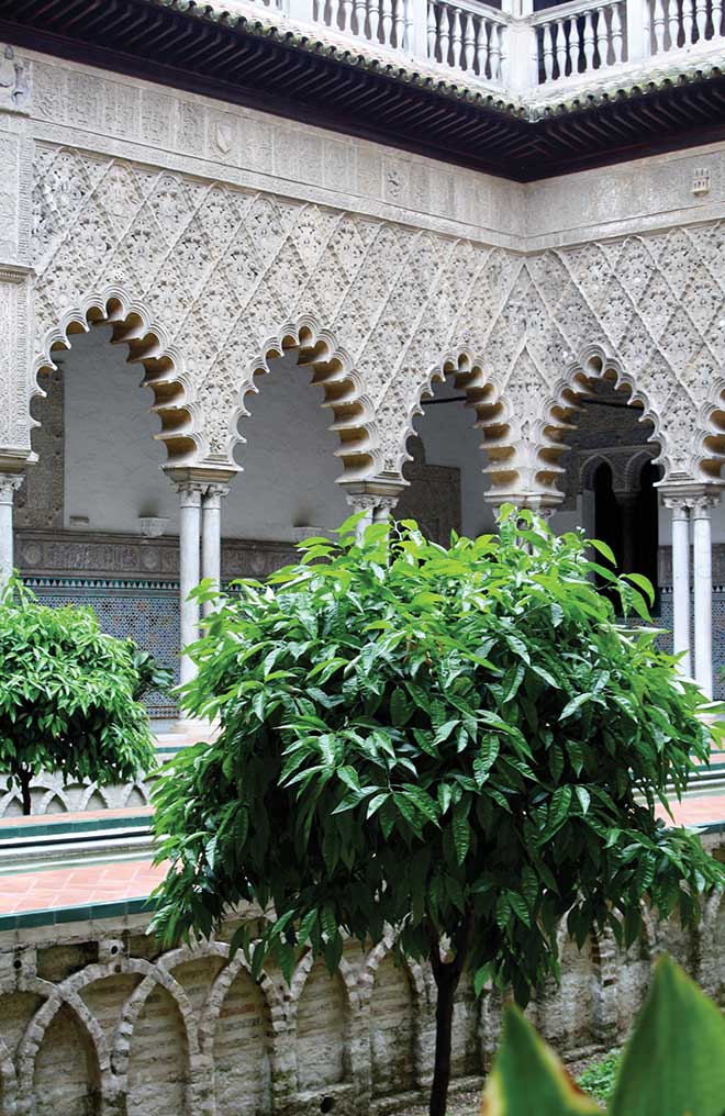 The Alcazar Royal Palace, which together with the cathedral dominates the historic old city, was originally a Moorish fortress and has fascinating Eastern features like ornate tilework and stucco frieze on the walls and ceilings, none of it depicting the human form, since that was forbidden by Muslims. Originally built in the 12th century by the Moors, the palace was later embellished in the 15th century by Seville’s Christian rulers, creating a style unique to this area called mudejar. It is this blend of Moorish and Christian features that so fascinates visitors. In fact, Alcazar, which means ‘the fort’ in Arabic, is among the 3,000 words derived from Arabic still used in Spain today!