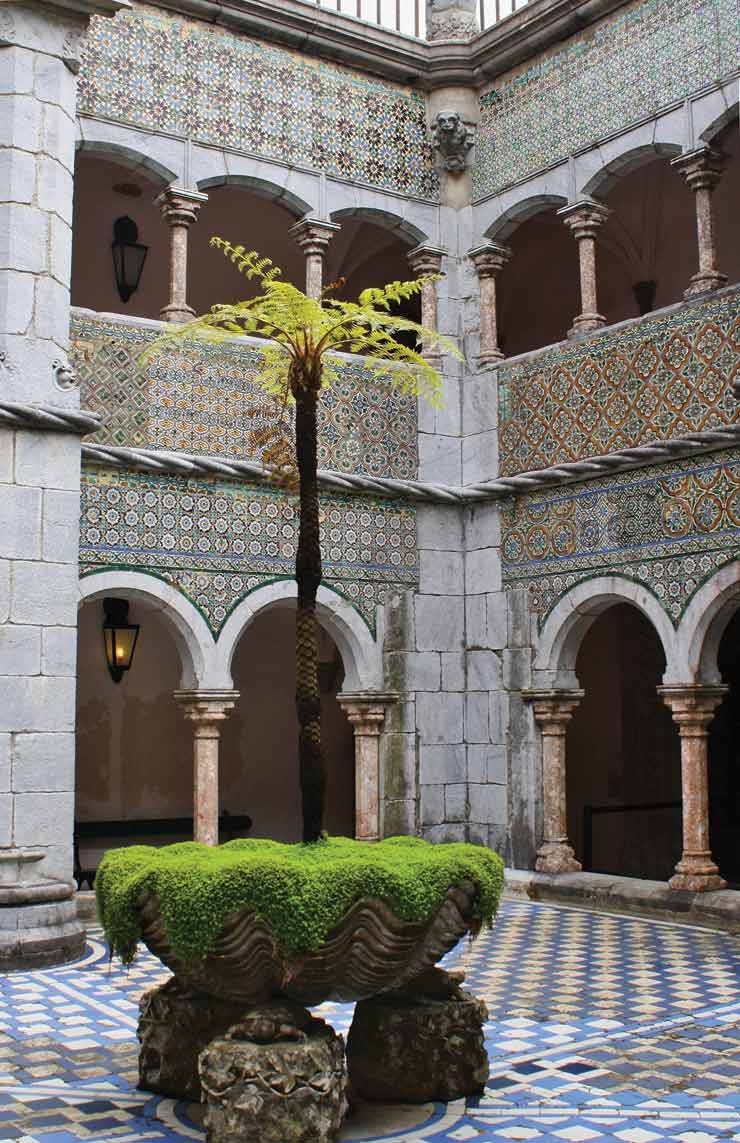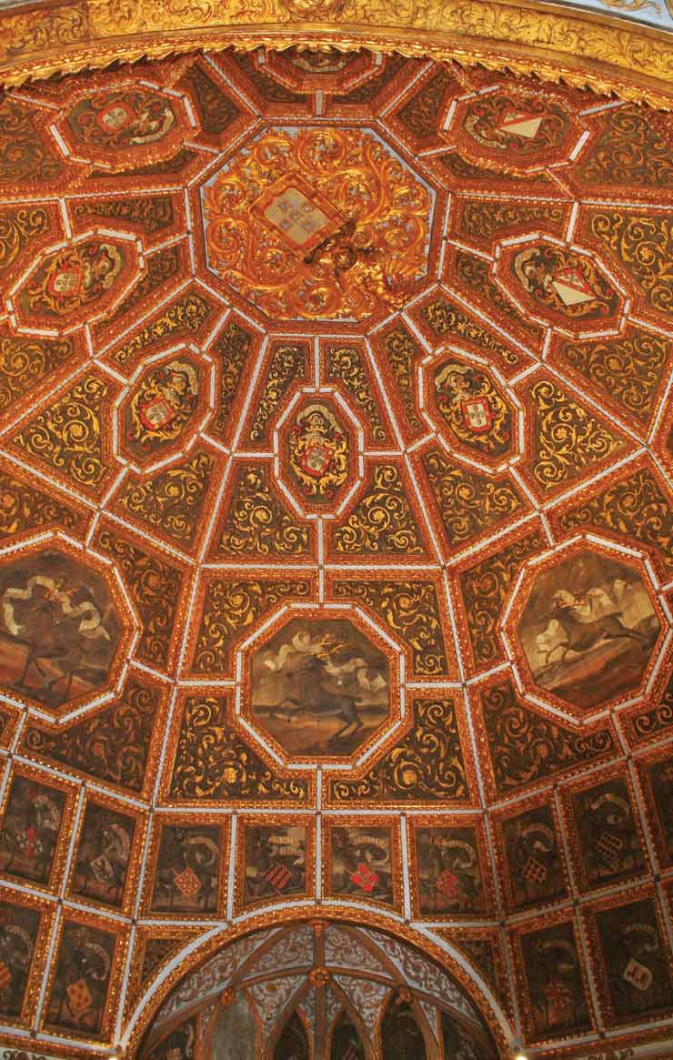Another royal structure, National Palace, sits in the heart of town and is the bestpreserved medieval palace in Portugal. It has been continuously inhabited from the early 15th through the late 19th centuries. An astounding blend of Gothic, Manueline and Moorish architecture, thanks to additions by various rulers, it has walls covered with stunning mudejar azulejos (painted tiles), Moorish arches and painted ceilings. The Sala das Pegas, or magpies room, depicts dozens of magpies on the ceiling to represent the gossip at court after King John I was caught kissing a lady in waiting. The amazing Sala dos Brasoes, or Blazons Hall, has a domed wooden ceiling with 72 gilded coats of arms representing the Portuguese royal families.