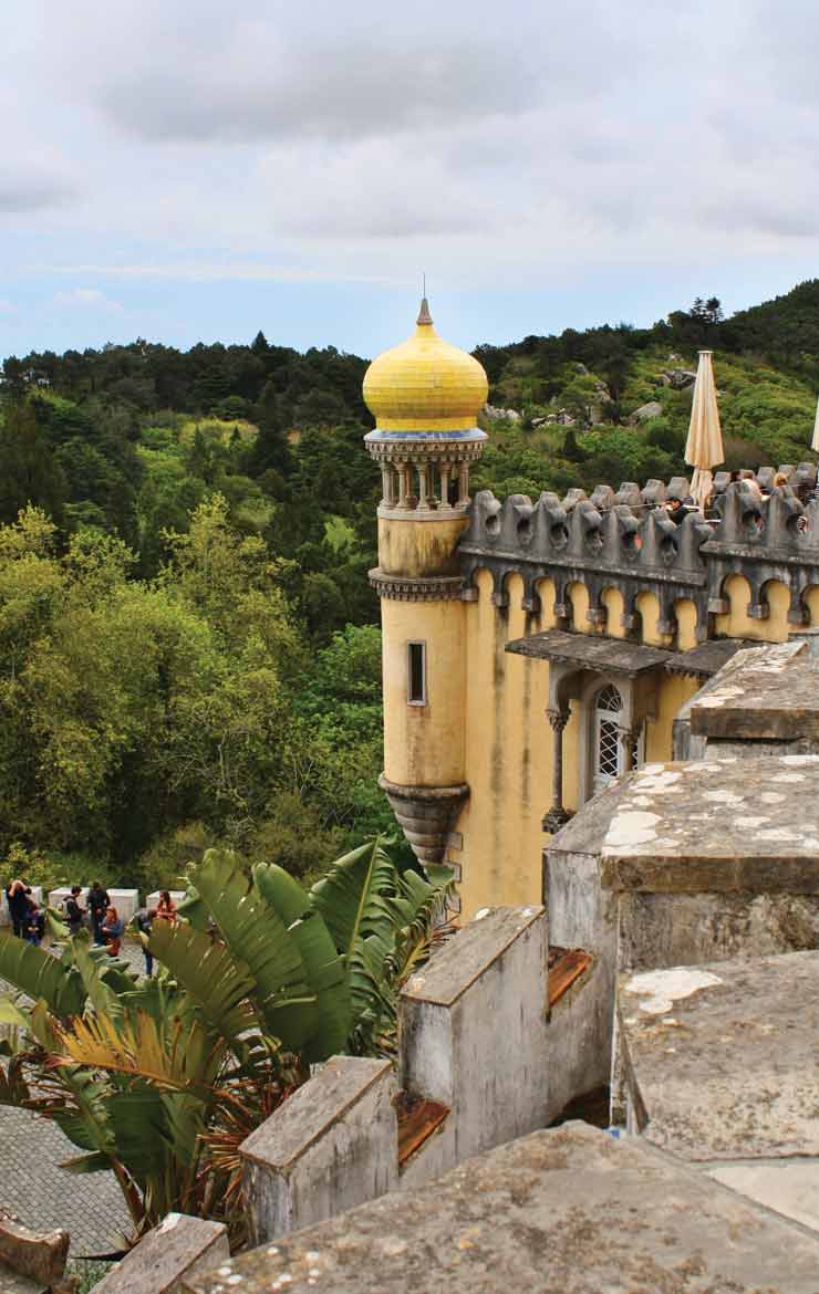 When you first approach, resist the urge to stop and explore the winding lanes with their shops and cafes. Save the shopping (and café-ing) for time in-between palaces. Start with the pièce de résistance, Pena palace, a surreal vision in red and yellow high on a hill. The red part was built in the 16th century, the yellow in the 19th. Legend has it that the site was selected as early as the 12th century for a Renal Palace Chapel, after a miraculous appearance there by the Virgin Mary. A monastery and chapel were built later by King Manuel, as thanks for the success of Vasco da Gama in finding a sea route to India and its spices in 1502. Much later, in 1838, Fernando II oversaw the amazing renovation and additions that created the neo-Manueline yellow portions of the structure.