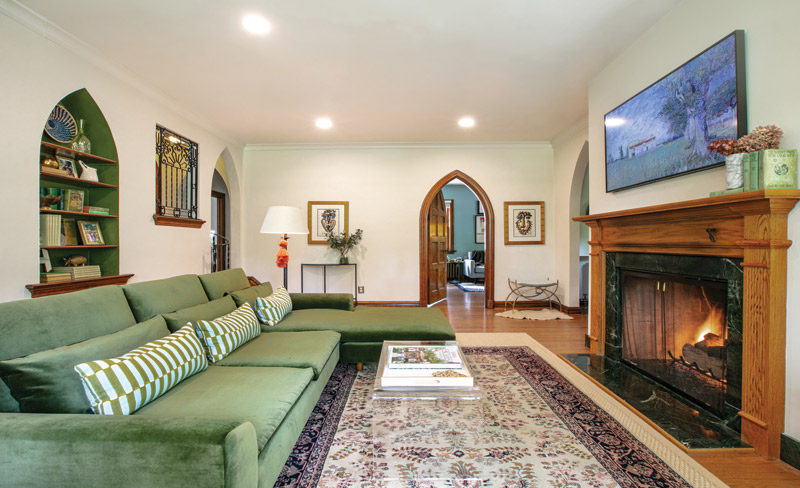 I love my living room. The beautiful oak of the archway and the woodwork are the focal points. The very first thing I wanted to buy was a green velvet couch to complement the wood tones. It was my starting point, and now, it’s my favorite thing. I love sitting in the living room; it makes me want to have people over.