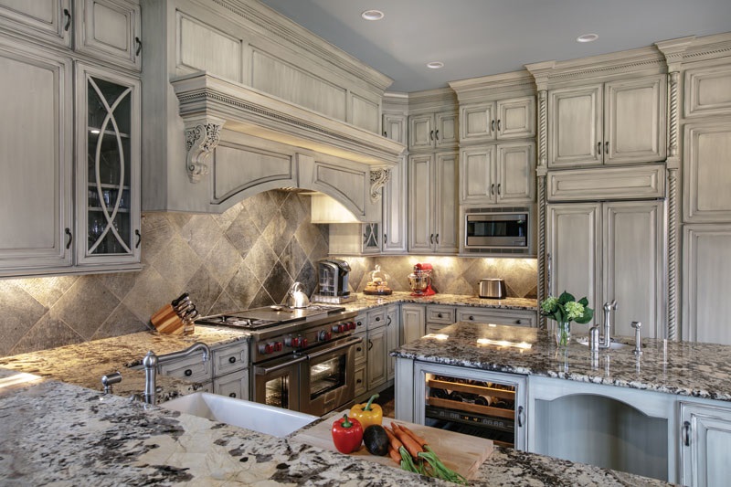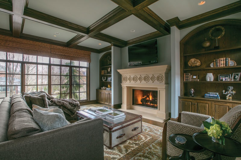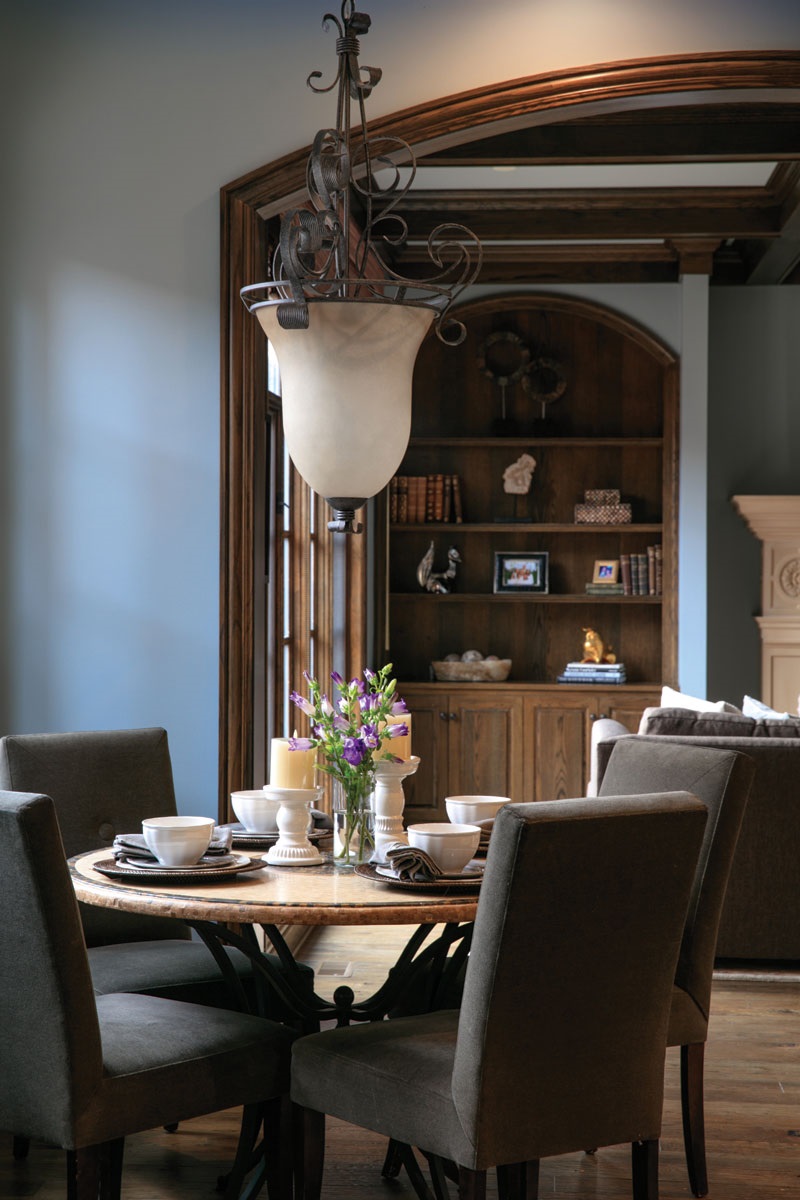 A | I wanted the style to work with the bones of the house and reflect my client’s tastes. I think the house has a really earthy feel with lots of wood and stone. There are stone floors in the living room, and the bar has big chunks of stone. The hearth room and the kitchen are heavy with lots of wood. My goal was something sophisticated with clean lines that would be warm, not cold or stark. I think the wallpaper in the powder room is a good example of the house’s style. It has the appearance of crushed gold and an interesting pebbled texture. It’s elegant but not overly ornate, and it looks really cool with the stone floor. I saw it and knew right away the homeowner would love it.