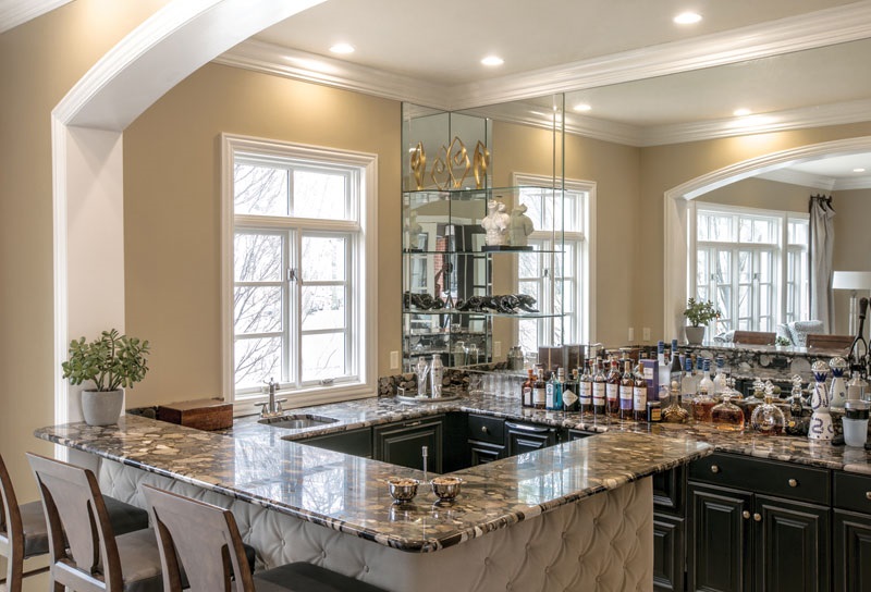 A | I love the overall openness and flow of the house. It is great for entertaining. The patio is accessible from both the living room and the kitchen. The living room has two walls of windows and is attached to the amazing bar. It’s very airy. I also love the transition from the living room to the hearth room. You flow from bright and open to warm and cozy.